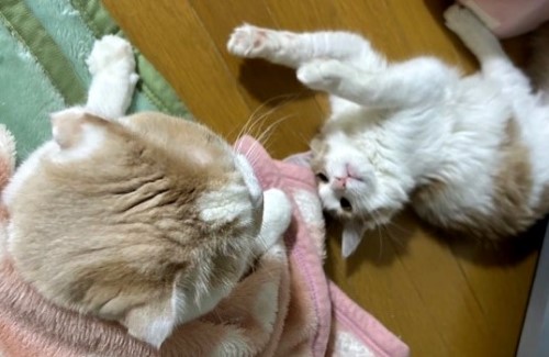 こゆきちゃんの猫パンチも、メルちゃんにとっては強めに遊んでもらっている感覚なのかも?
