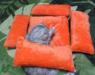 暖かそうなオレンジ色のベッドでふぅちゃんとつぶちゃんが